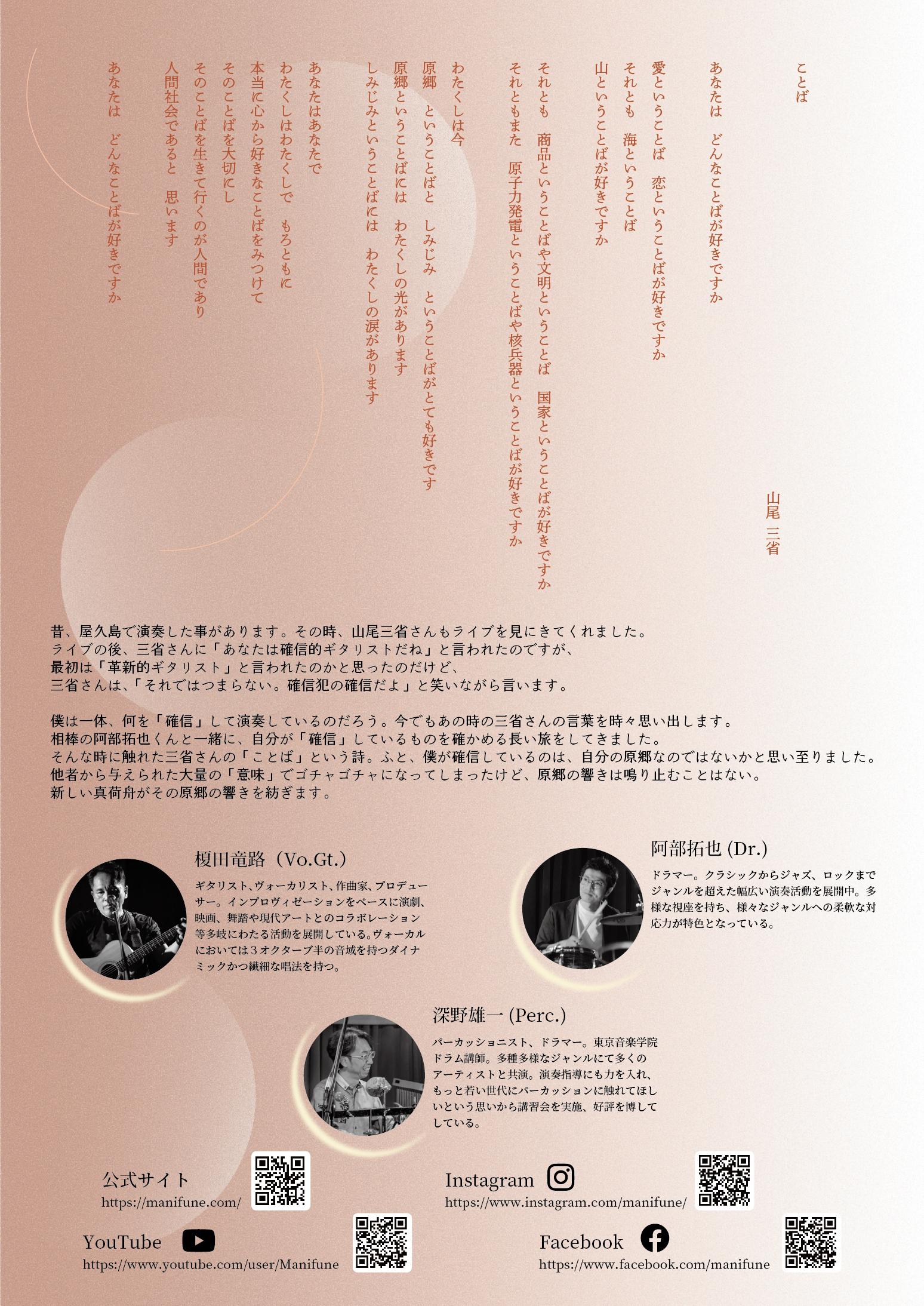 午後1時からは認知開発®︎手法についての講演とワークショップ午後7時からは榎田(Vo,Gt)と、打楽器奏者、阿部拓也のユニット「真荷舟(まにふね)」のライブです。
